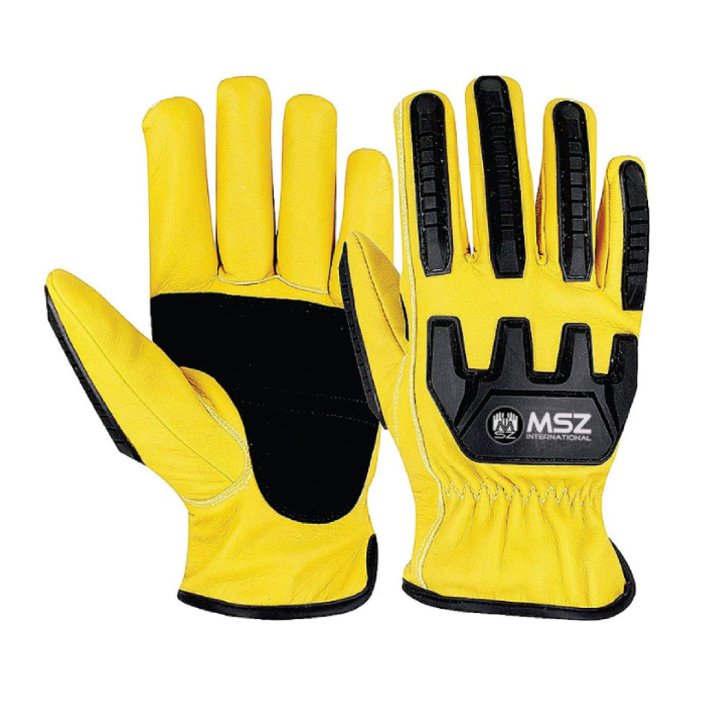 Driver Gloves Palm & Back Made of Cowhide Yellow Leather with Extra reinforcement on palm, Back TPR plastic Protection on fingers, thumb & Knuckle, Black tape piping on edge.