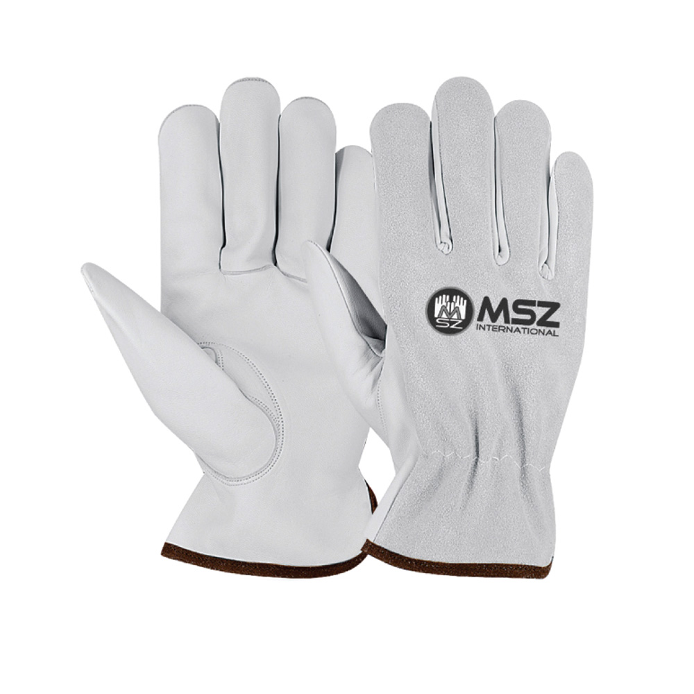 Driver gloves Palm made of cowhide grey leather & Back cow-split leather, Key Stone Thumb, Elastic on wrist, black tape piping on edge.